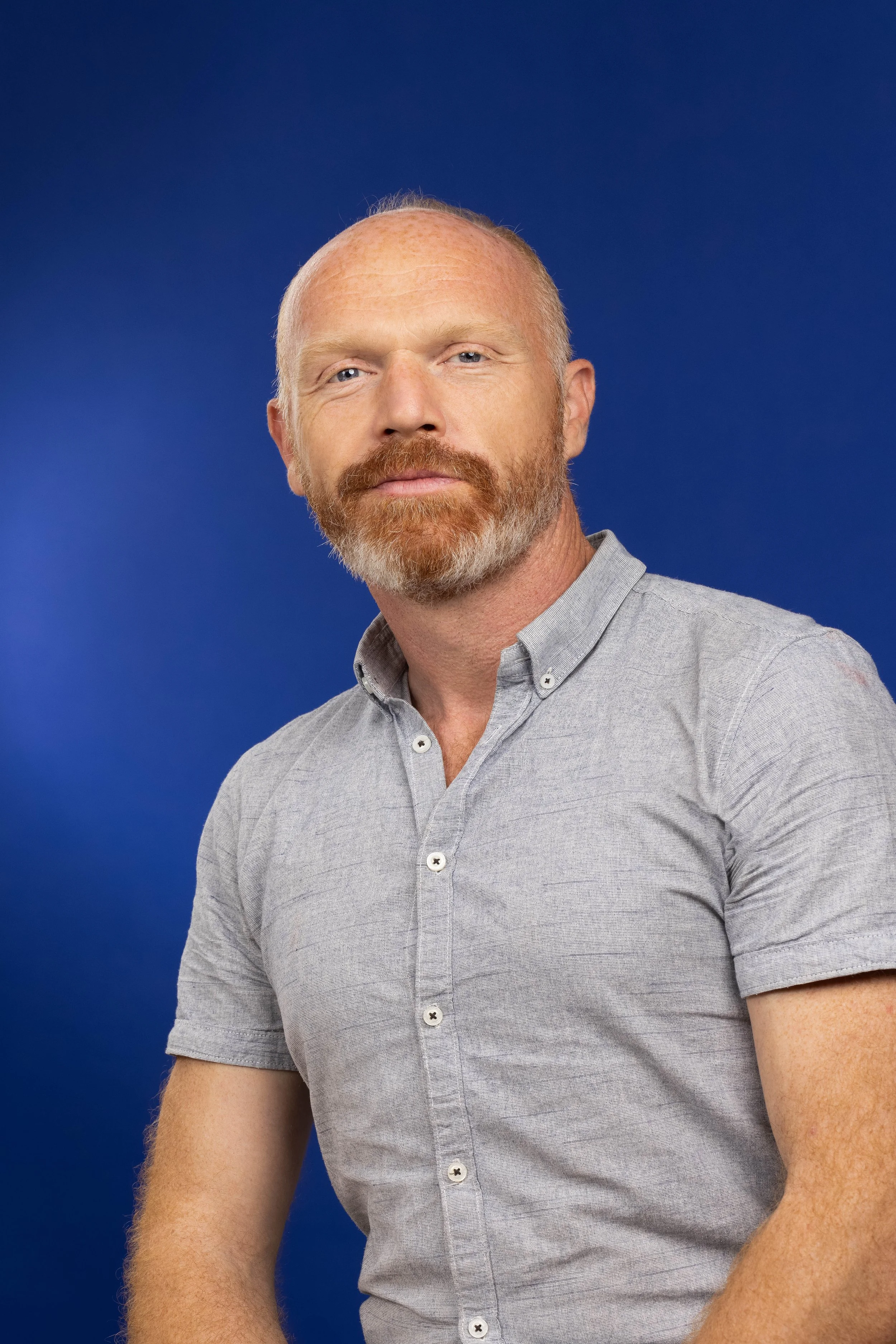 A man with a beard and mustache wearing a light gray button-up shirt against a blue background.